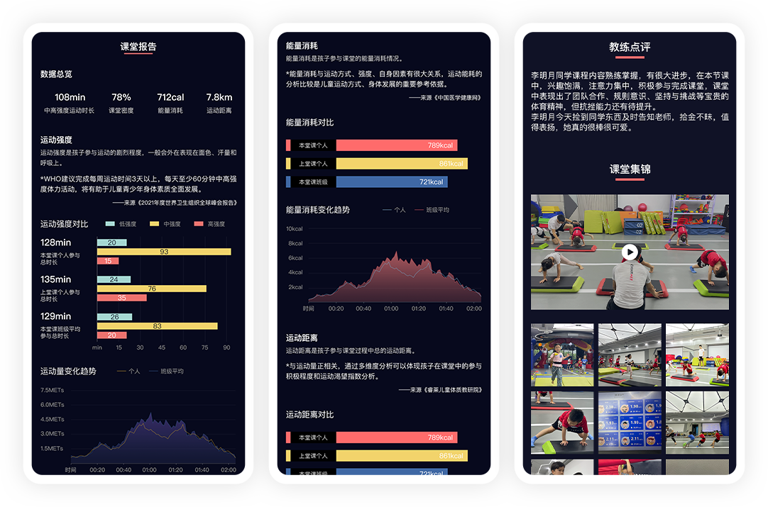 课堂报告通过数据化呈现孩子的能量消耗、中高强度运动时长、课堂密度、国际儿童体力活动量表、国际儿童能量消耗量表等,让家长对运动强度和能量消耗有一个更直观的认知,让每节课的教学成果可视化,从而进一步提高家长的认可和满意度。