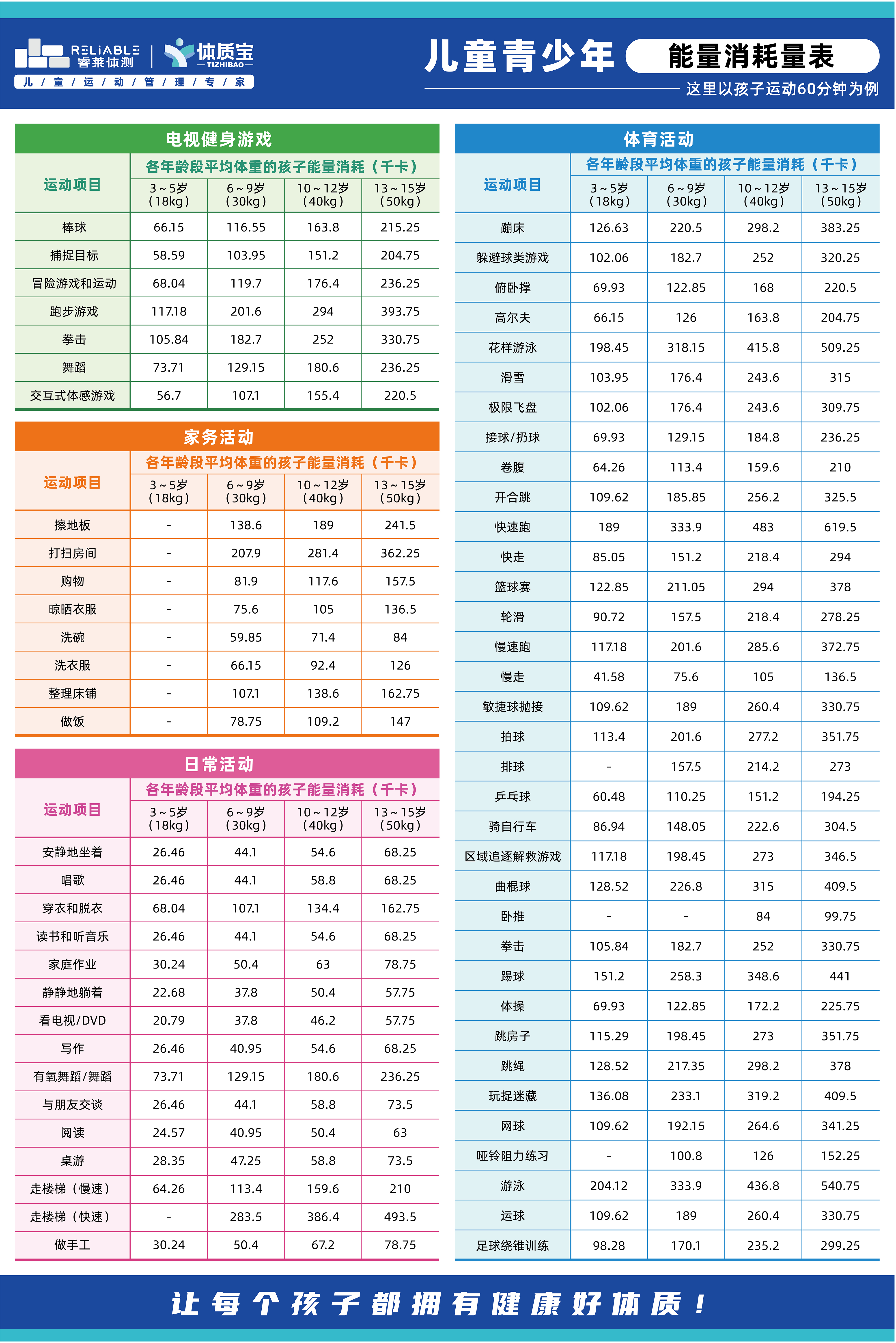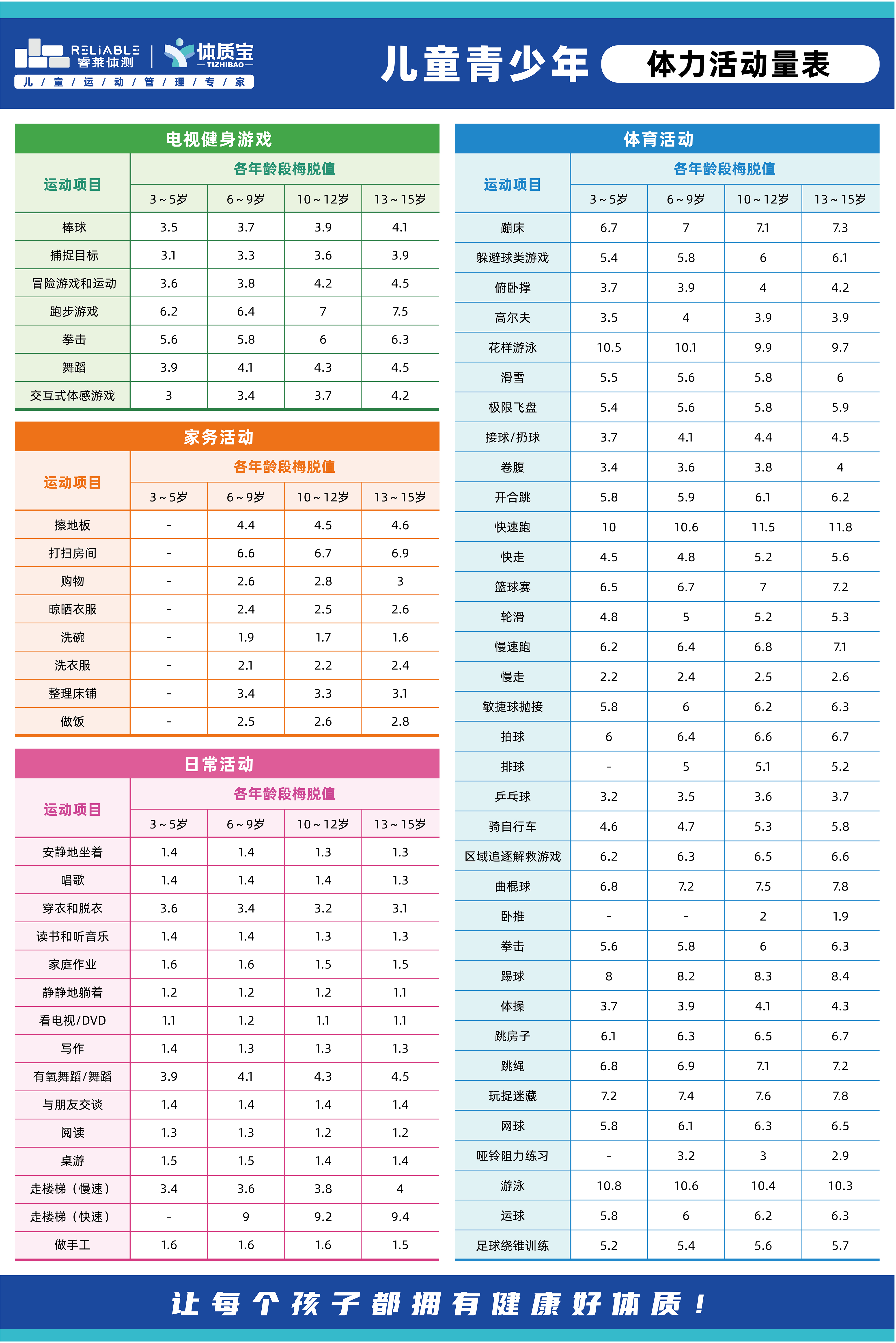 国际儿童体力活动量表细化不同年龄阶段孩子参与「家务活动」-「日常活动」-「体育活动」-「电视健身游戏」等运动项目的梅脱值和卡路里,家长可以进行查找对照。