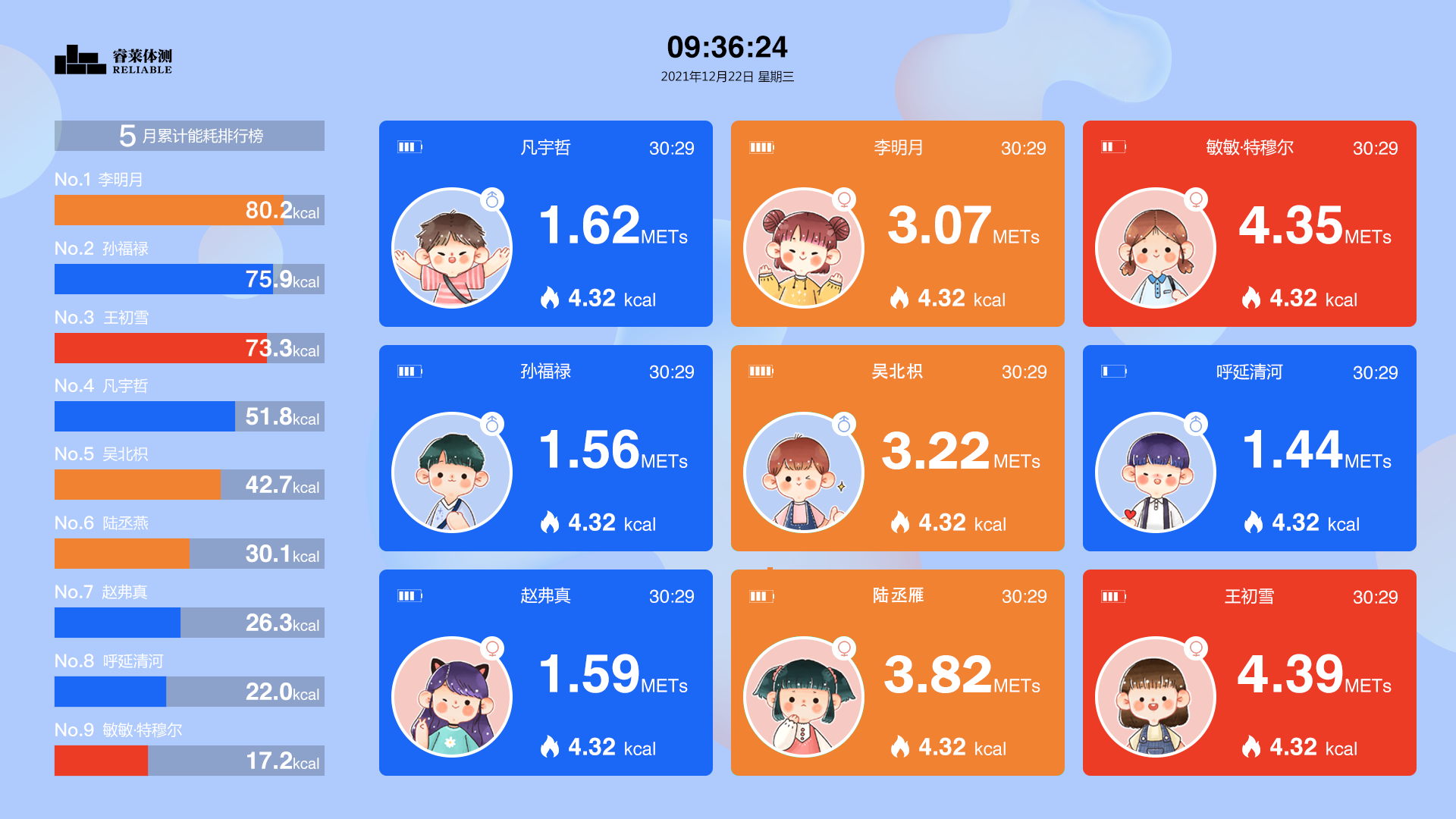 基于智能穿戴技术,在每一种运动模式下,体质宝内置的高精度传感器配合智能算法,都可以精准监测并识别学生的一举一动,实时记录运动过程中的重要数据,运动强度、运动能耗、中高强度运动时长……,并通过运动监测大屏实时显示班级整体、学员个人的课堂运动情况。