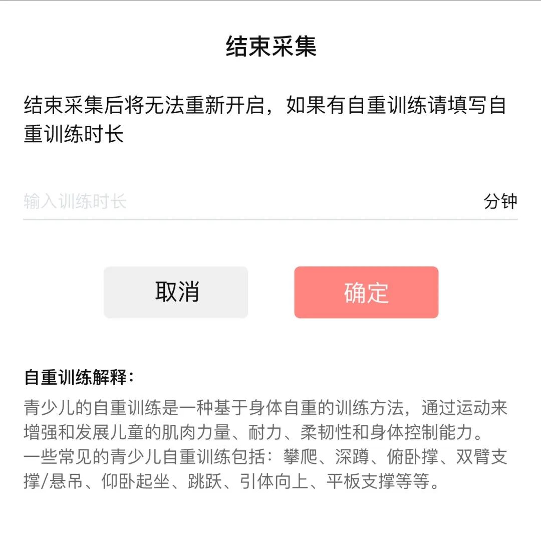 教练在教学过程中,通常也会安排一些抗阻训练,为了让学员课堂运动过程中的强度数据更精准,教练在课程结束时,可在「教练端」小程序中点击「结束采集」,并填写相应的自重训练时长。
