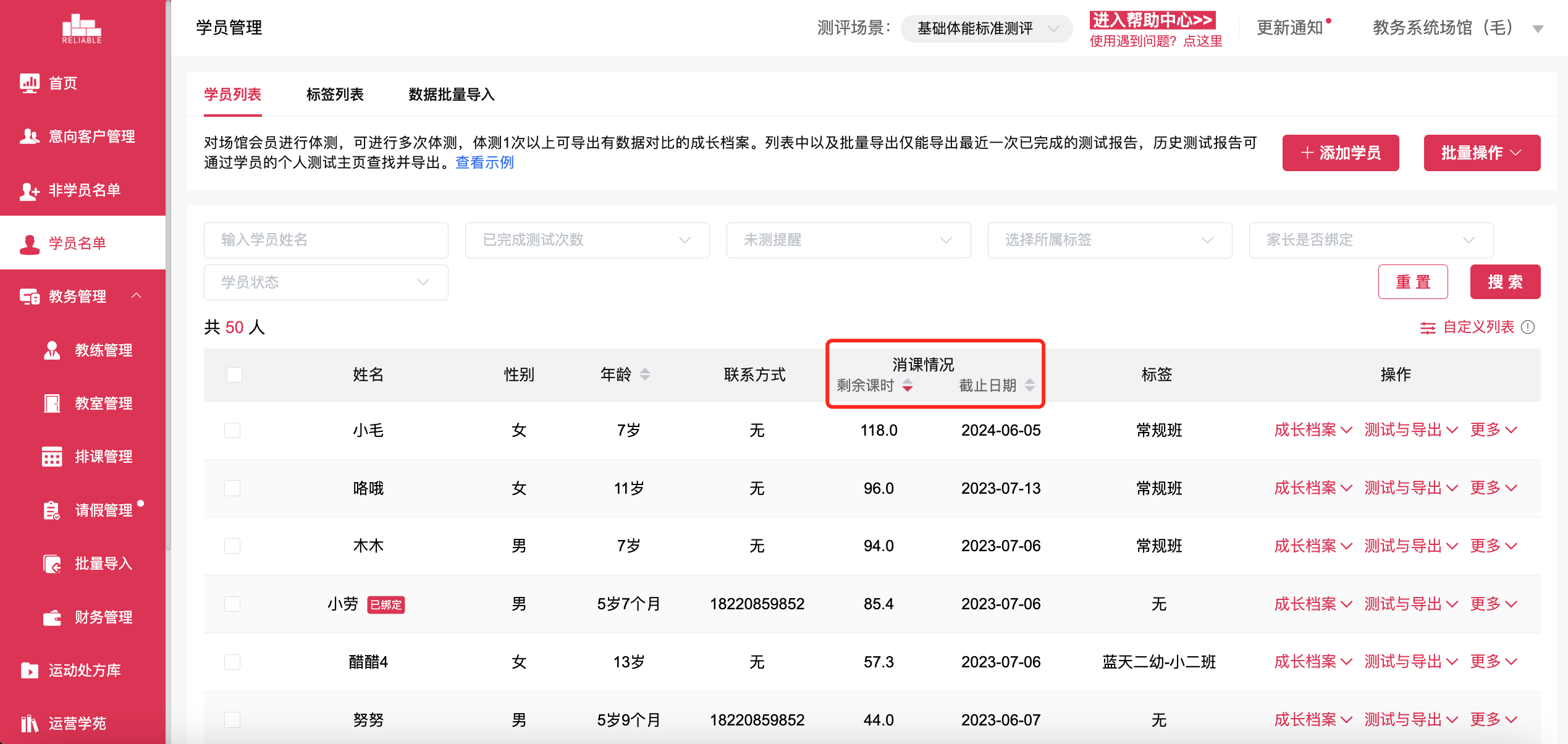 首先,教练可以在睿莱教务系统后台「学员名单」中选择任意学员并点击「消课情况」,可直观了解到该学员当前剩余课时情况,并查询学员课程截止日期,筛选统计出待续费学员名单。