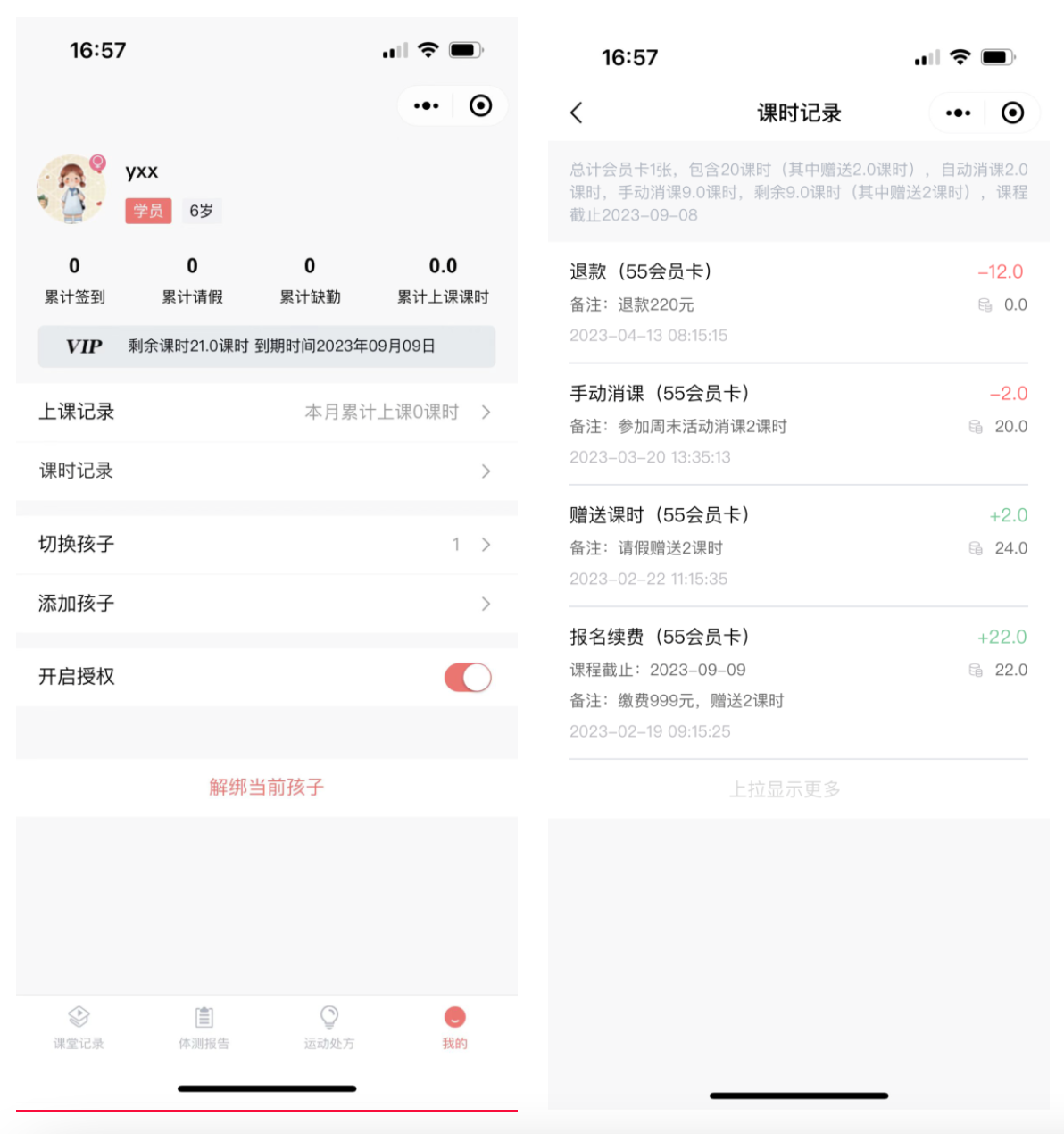 家长在睿莱家长端小程序自主查看学生课时记录,课消明细,剩余课时,实时动态显示学生费用情况,课时消耗一目了然。