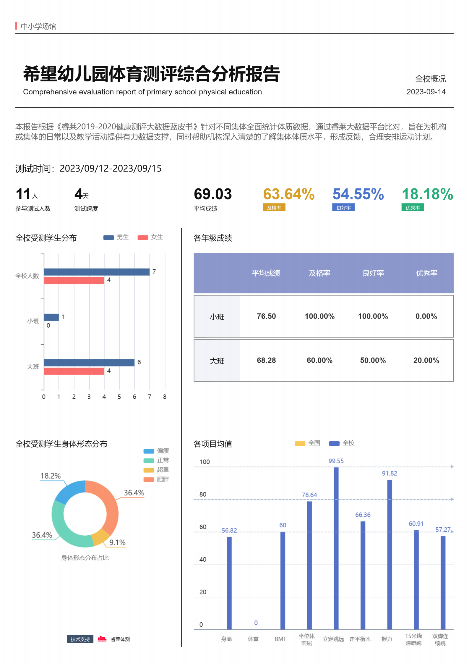 通过对班级和园所孩子健康状况整体的分析评价,老师能更好地发现班级孩子共同的短板,针对不足之处,合理有效的制定教学计划,有针对性的对孩子进行训练,帮助和促进孩子健康成长。